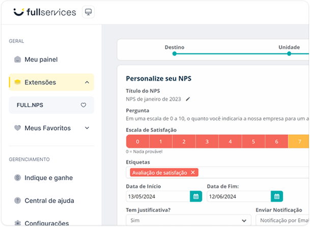Com a FULL Services, você coleta avaliações reais dos seus clientes, monitora o NPS em tempo real e analisa a satisfação geral de forma estratégica. Identifique pontos fortes, descubra oportunidades de melhoria e tome decisões mais inteligentes.