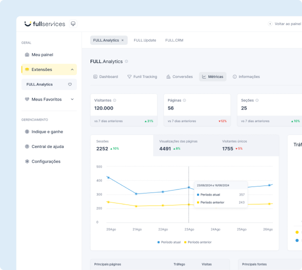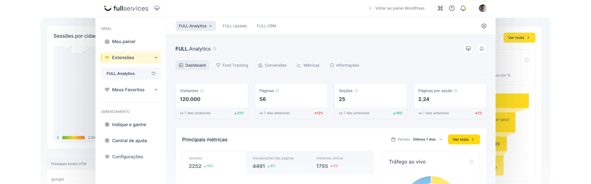 O FULL Analytics oferece uma visão clara e detalhada do desempenho do seu site, mostrando de onde vêm seus visitantes, como navegam pelas páginas e onde desistem da jornada. Com relatórios intuitivos, funis de conversão e rastreamento em tempo real, você identifica gargalos, otimiza campanhas e toma decisões estratégicas com base em dados reais. Tudo direto no WordPress.
