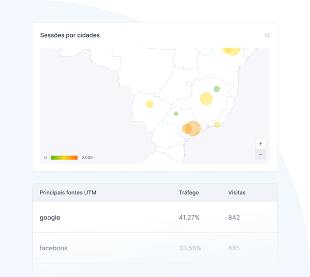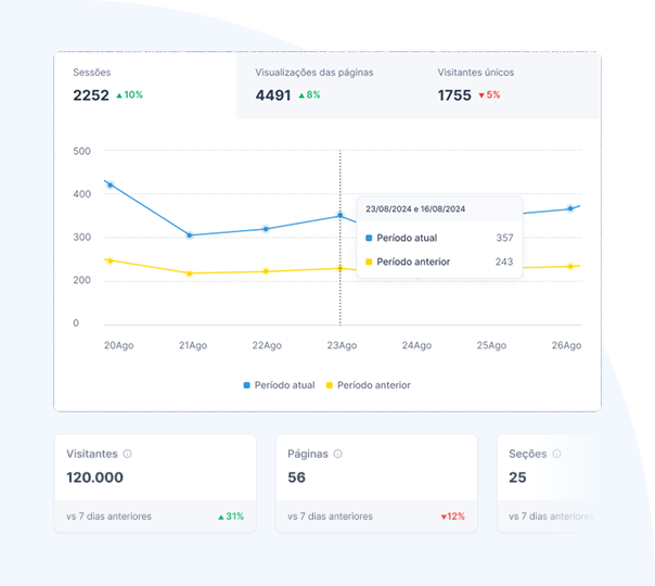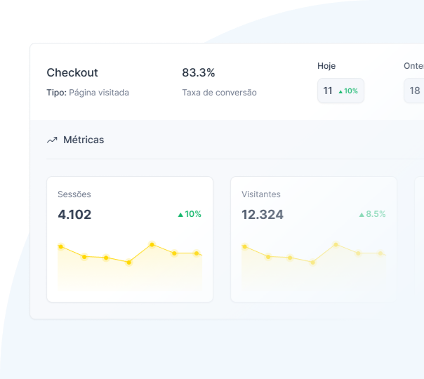 Acompanhe sessões, visitantes e páginas vistas em tempo real em um painel simples e direto.