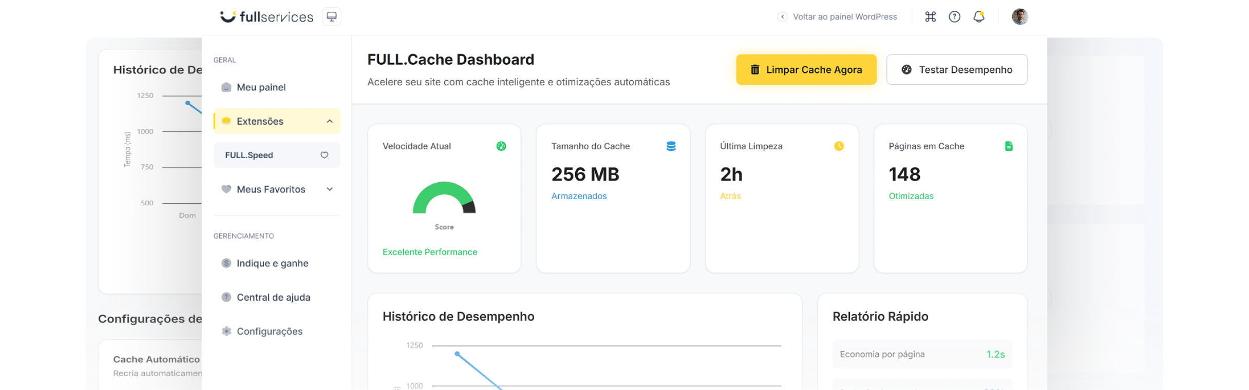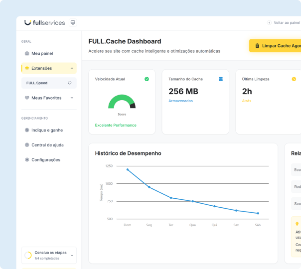 O FULL Cache é a extensão que leva o desempenho do seu site WordPress a outro nível. Com tecnologia de cache avançada, compactação e otimização automática, seu site carrega em segundos — melhorando o ranqueamento no Google e a experiência de cada visitante.