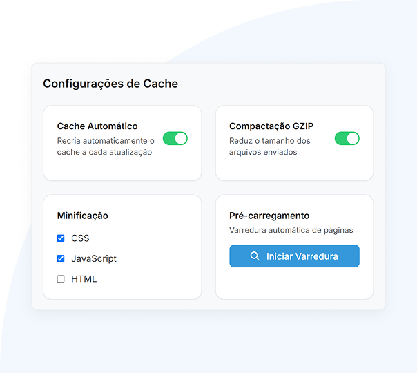- Cache inteligente para páginas, posts e arquivos estáticos