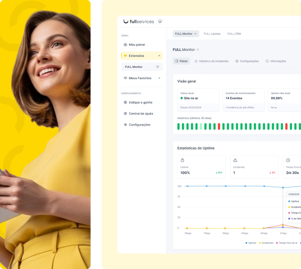 Antes do FULL Monitor, só descobríamos as quedas quando os clientes reclamavam. Agora somos avisados imediatamente e conseguimos manter o site disponível.