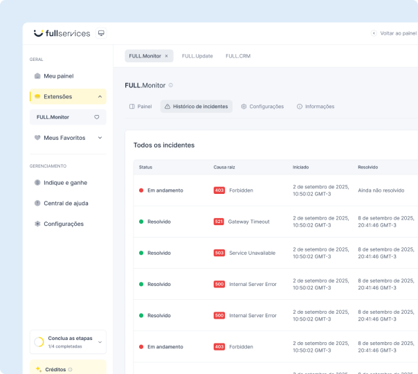 O FULL Monitor garante monitoramento contínuo da disponibilidade do seu site WordPress. Receba alertas instantâneos sempre que houver queda, acompanhe o histórico de incidentes e mantenha a confiança dos seus usuários sem depender de sorte ou relatórios manuais.