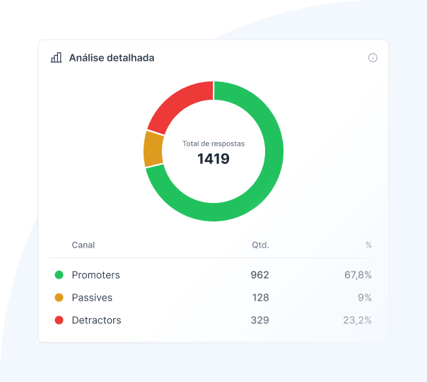 Acompanhe a evolução do seu NPS e visualize relatórios com distribuição entre promotores, neutros e detratores.