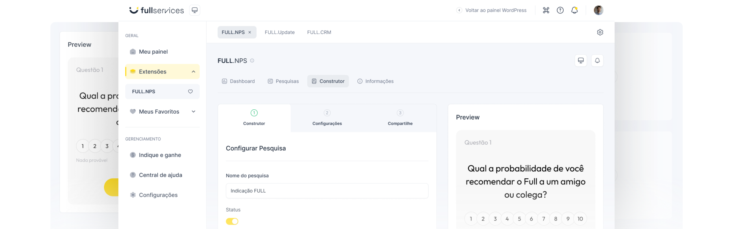O FULL NPS é uma extensão para WordPress que permite medir a satisfação e a lealdade dos seus clientes com pesquisas rápidas e automáticas. Você coleta respostas diretamente no site, acompanha métricas em tempo real e descobre onde melhorar para aumentar a retenção e fidelização.