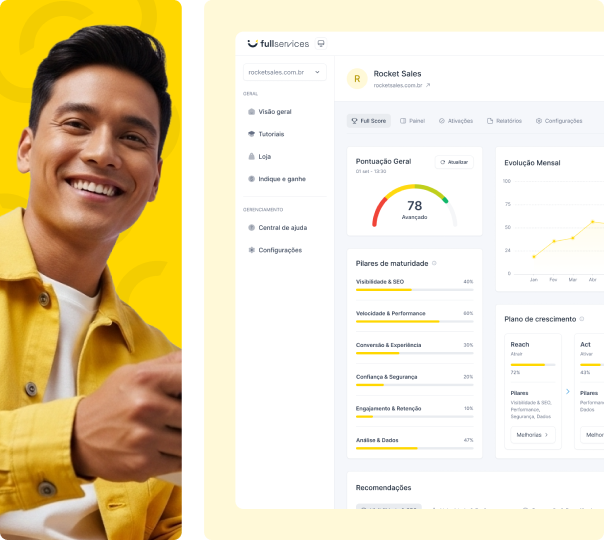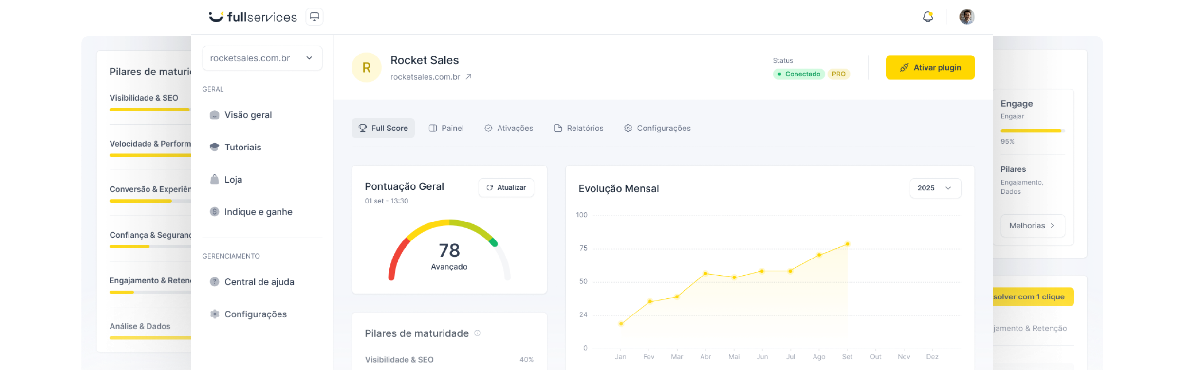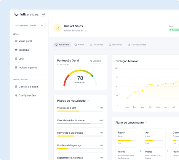 O FULL Score avalia automaticamente os principais pilares do seu site e mostra onde você precisa agir para alcançar mais performance, segurança e crescimento.