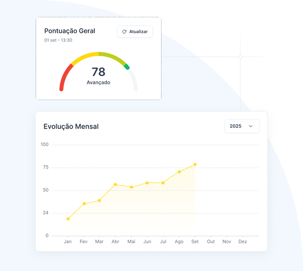 Acompanhe relatórios claros e a evolução do score ao longo do tempo.