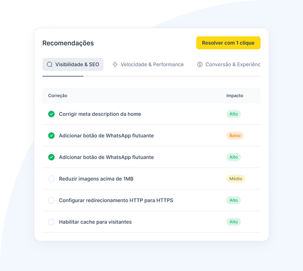Identifique problemas reais e receba orientações simples e priorizadas, para agir com eficiência sem precisar de conhecimentos técnicos avançados.