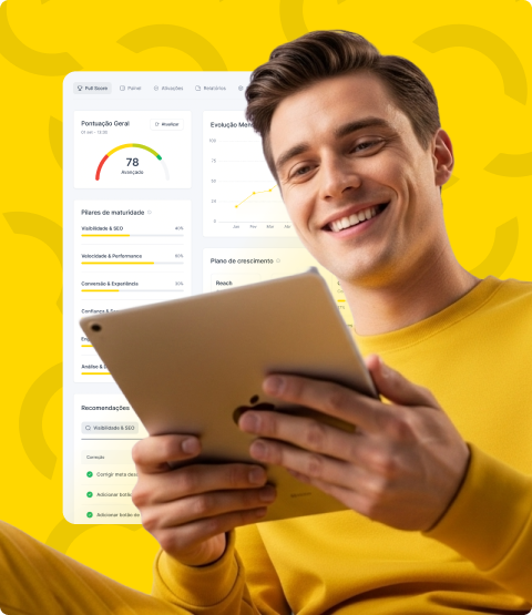 Tenha uma visão completa da maturidade digital do seu site em um único painel, com dados fáceis de entender e evolução acompanhada mês a mês.