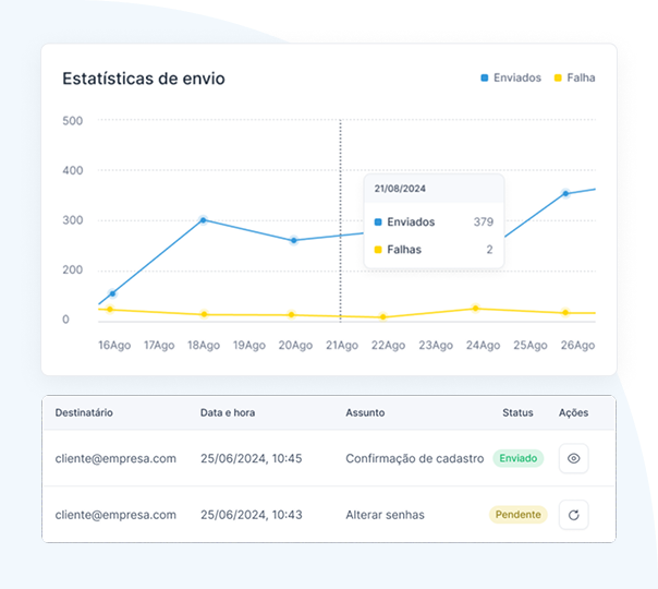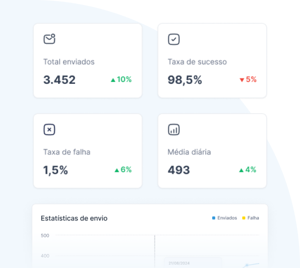 Acompanhe métricas detalhadas de envio, sucesso e falhas em tempo real.