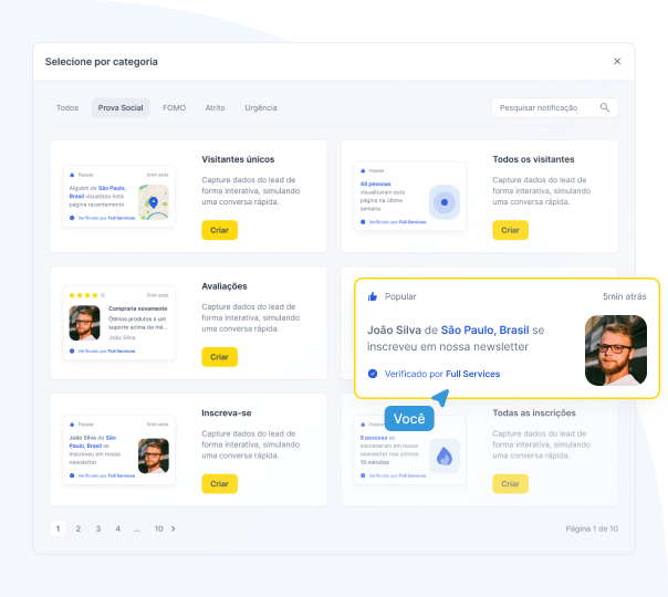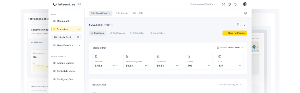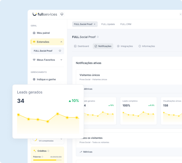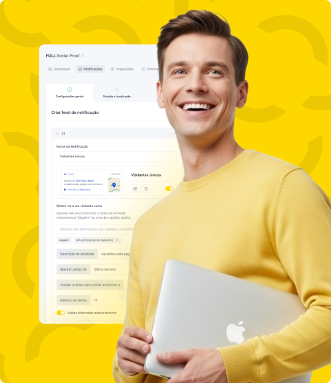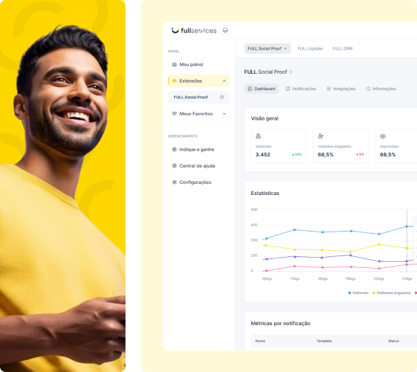 O FULL Social Proof transforma interações reais do seu público em notificações inteligentes exibidas no seu site. Com ele, você aumenta a confiança, prova credibilidade e impulsiona conversões exibindo compras, avaliações, cadastros e muito mais.