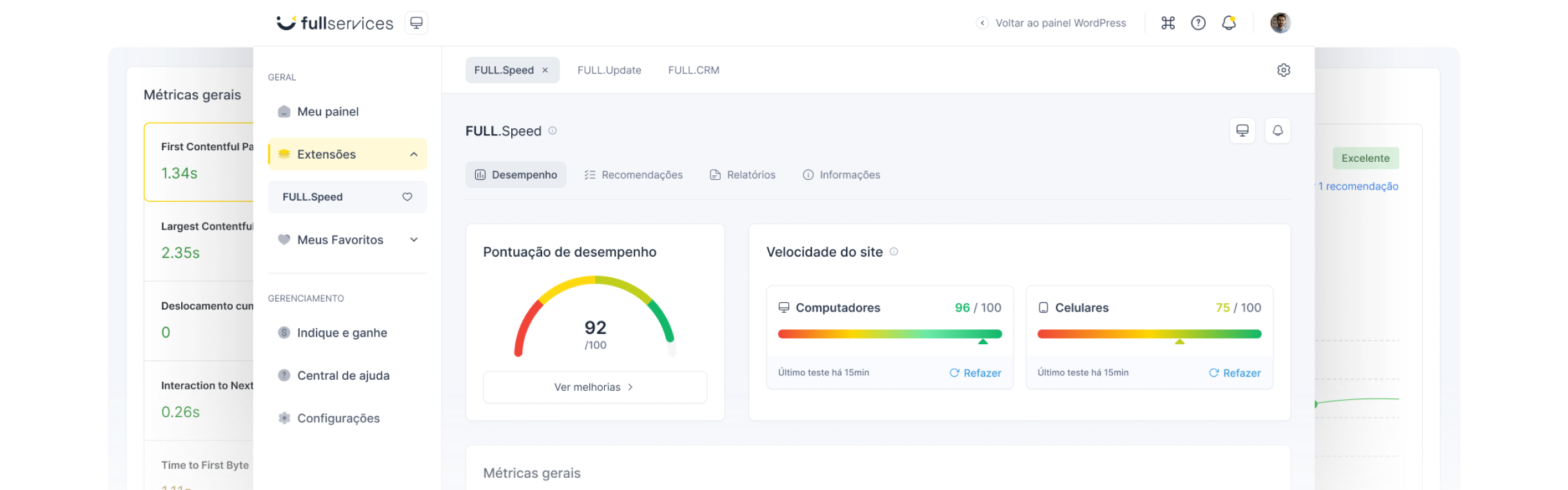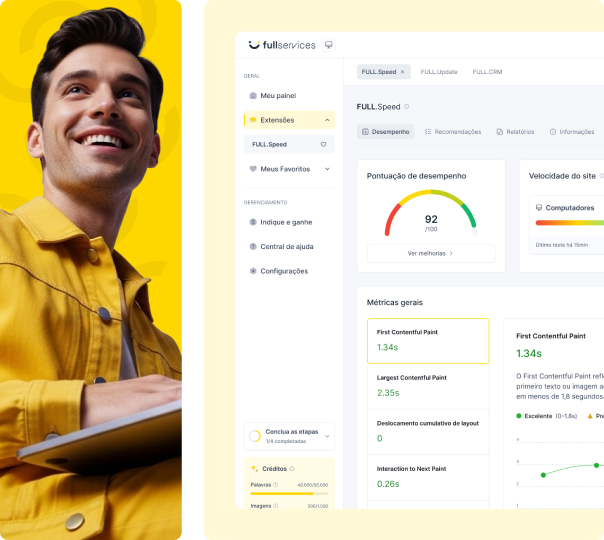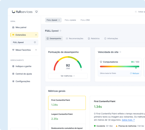 A FULL Speed é uma solução completa de otimização de performance para WordPress. Ela atua em todas as camadas — servidor, código, imagens e estrutura — para entregar carregamentos instantâneos, melhores notas no Google PageSpeed e experiência superior para os usuários.