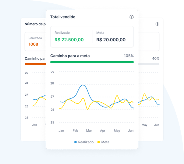 Defina e acompanhe metas de vendas e KPIs com previsões visuais e indicadores centralizados.