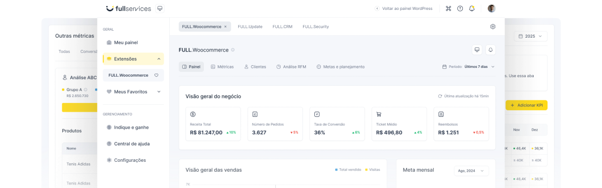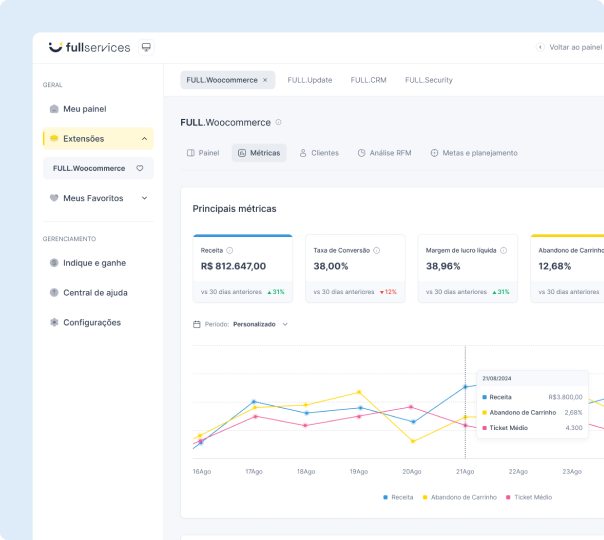 O FULL WooCommerce centraliza todos os dados da sua loja em um painel único e intuitivo, permitindo que você monitore vendas, pedidos, comportamento de clientes e performance de produtos em tempo real. Tome decisões estratégicas baseadas em dados precisos e visualize tendências para escalar suas vendas online.